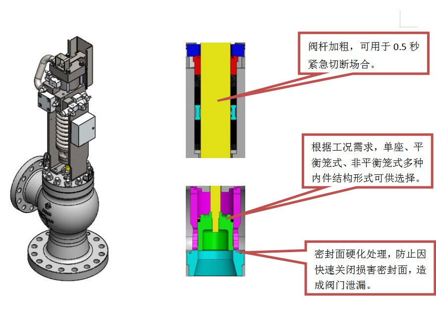 在動力系統(tǒng)方面,切換閥利用液壓-彈簧快關(guān)原理,采用彈簧來儲備能量,快關(guān)時彈簧釋放能量并迅速關(guān)閉閥門,工作穩(wěn)定、安全可靠;