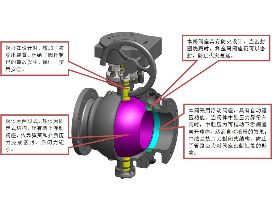 球閥是用帶有圓形通孔的球體作為啟閉件,在閥桿驅(qū)動(dòng)下球體圍繞閥桿中心作0~90°旋轉(zhuǎn),完成啟閉功能,體積小、重量輕、結(jié)構(gòu)簡(jiǎn)單,本閥球體為固定式結(jié)構(gòu),閥座相對(duì)球體具有浮動(dòng)功能,在介質(zhì)壓力作用下能保證進(jìn)口密封性能;